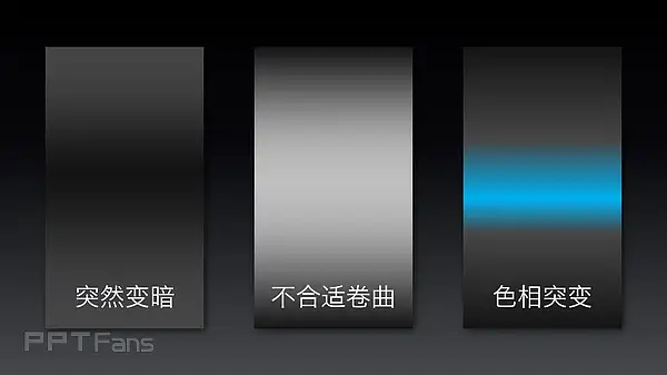 另外,渐变不要出现突变,突然变亮,突然变暗,突然色相改变很多都属于这一范畴,错误示例见下图: