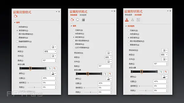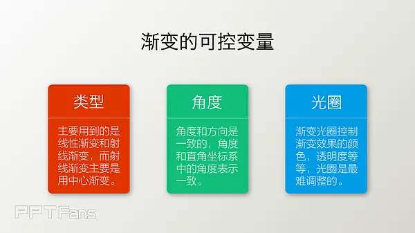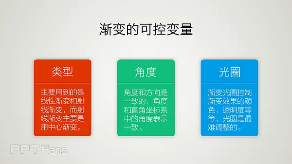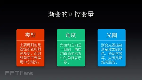 在幻灯片中,大多数的效果都是通过控制一些参数来实现,我将其称为可控变量。渐变效果的可控变量主要有三个。渐变类型,渐变方向和渐变光圈。