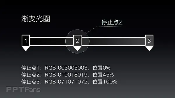 这一点对于用于投影的所有幻灯片几乎都是成立的。这里的明和暗是个什么概念呢?暗是渐变光圈的所有停止点的RGB的数值控制在72附近及以下,明是渐变光圈的所有停止点的RGB的数值控制在200附近及以上。