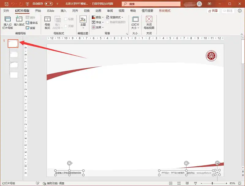 修改箭头所指示的第1张幻灯片母版的相应信息即可