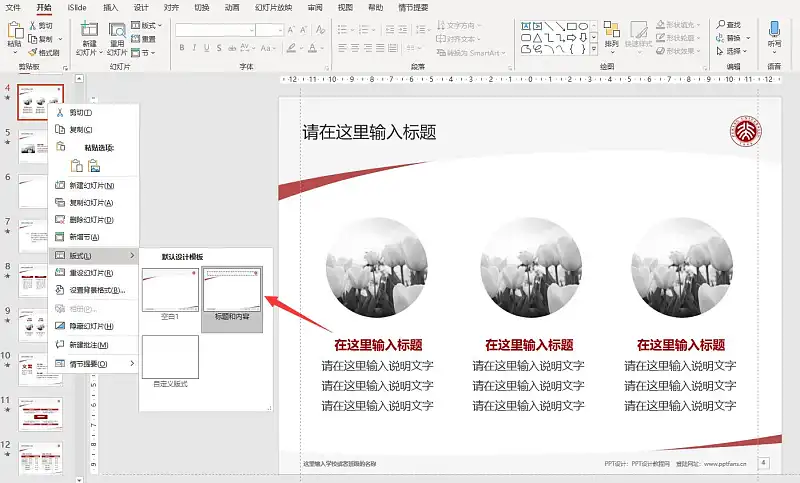 在新建页面后,如果没有特殊设置,是会自动调用该母版的(母版设计时已经考虑到),无需另行设置,若不能自动调用,直接在页面左侧小窗中,右键选取【板式】-【默认设计模板】-【标题和内容】即可。