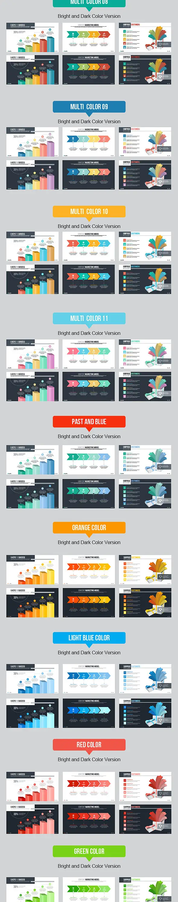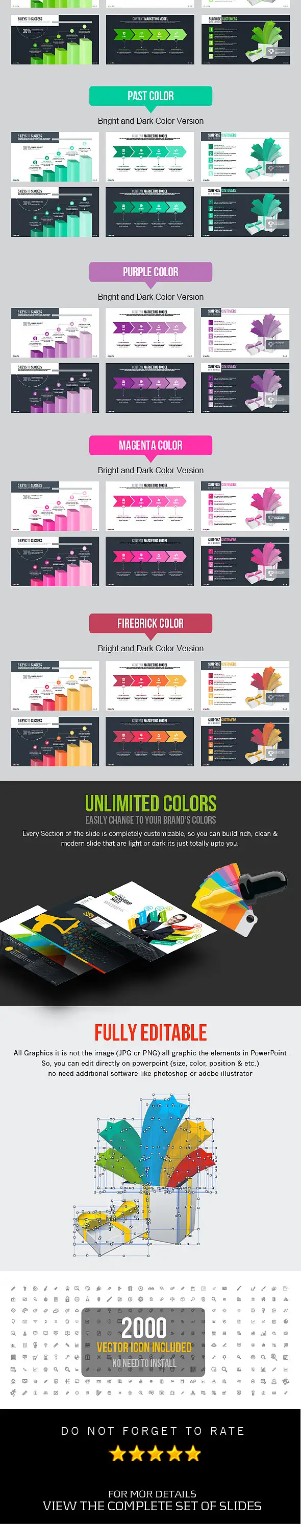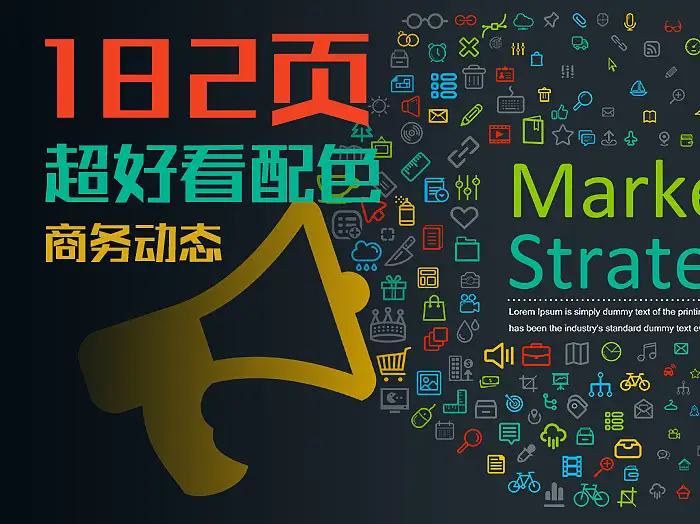 本套模板包含182页内页设计,四十种主色,方、宽屏比例皆有,PPTX格式模板,适合PowerPoint2003/2007/2010/2013/2016等版本,kEYNOTE/WPS适用,完全可编辑,图片占位符点击后自行替换图片。非常好用哦!建议使用Office2013以上版本编辑使用本模板,以保证最佳效果。