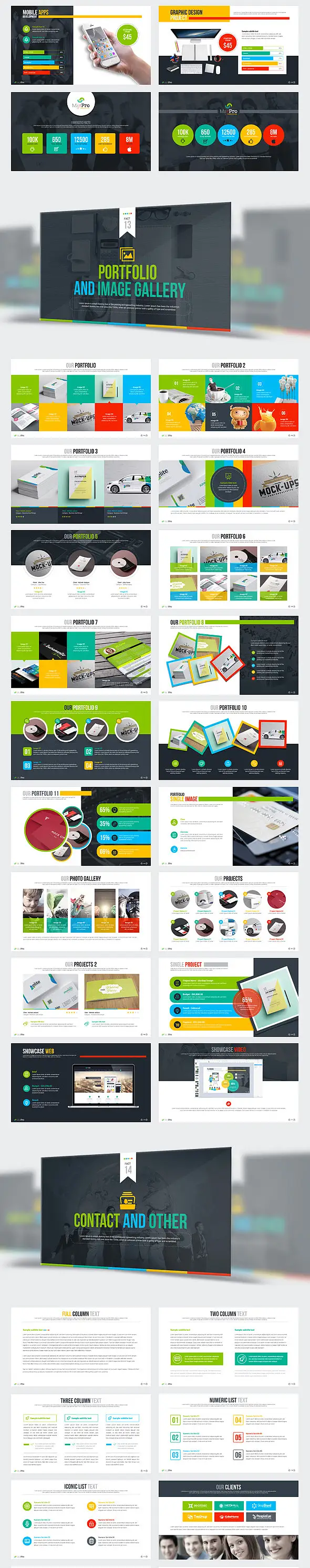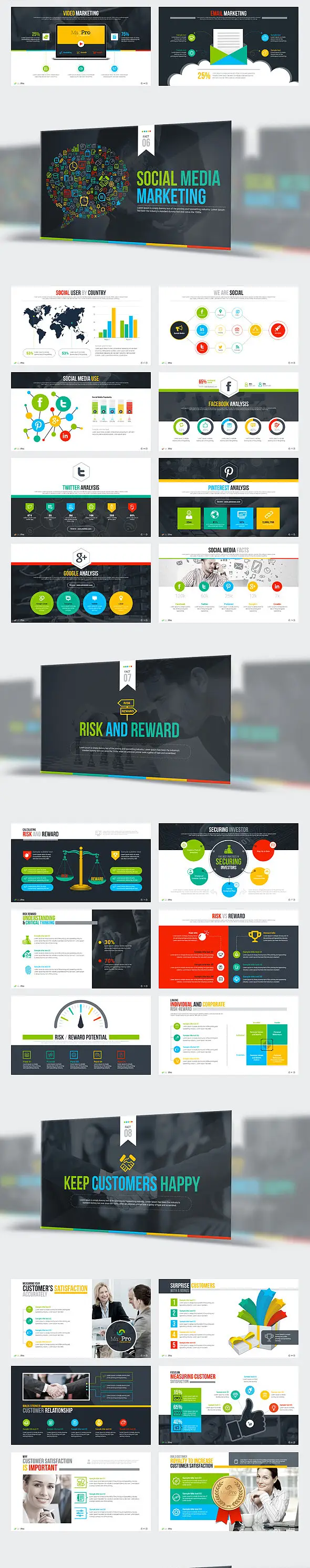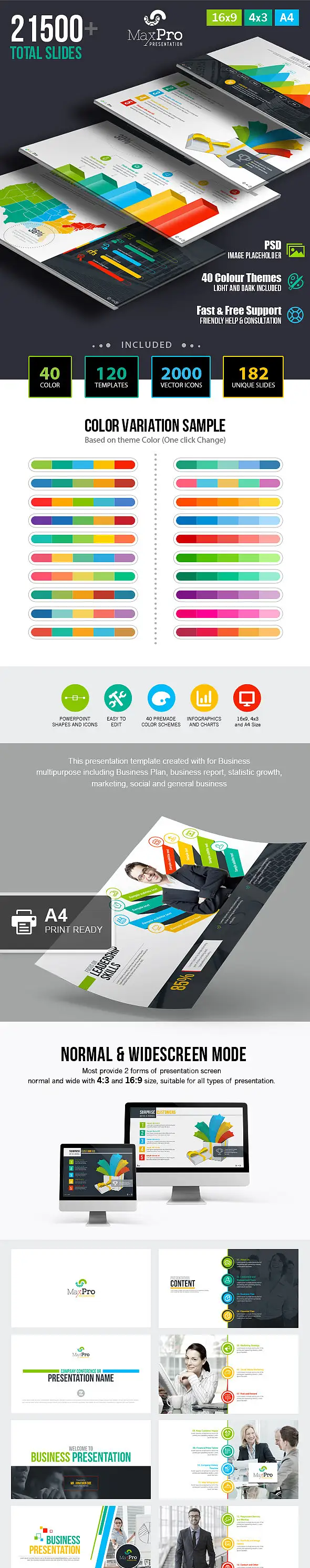 本套模板包含182页内页设计,四十种主色,方、宽屏比例皆有,PPTX格式模板,适合PowerPoint2003/2007/2010/2013/2016等版本,kEYNOTE/WPS适用,完全可编辑,图片占位符点击后自行替换图片。非常好用哦!建议使用Office2013以上版本编辑使用本模板,以保证最佳效果。
