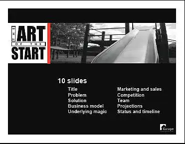 10页:不要用很多的内容来使你的PPT显得很充实,10页足已,太多的内容让人更无法记住重点。而如果你是写给VC,Guy Kawasaki建议可以写下面的10个要点: